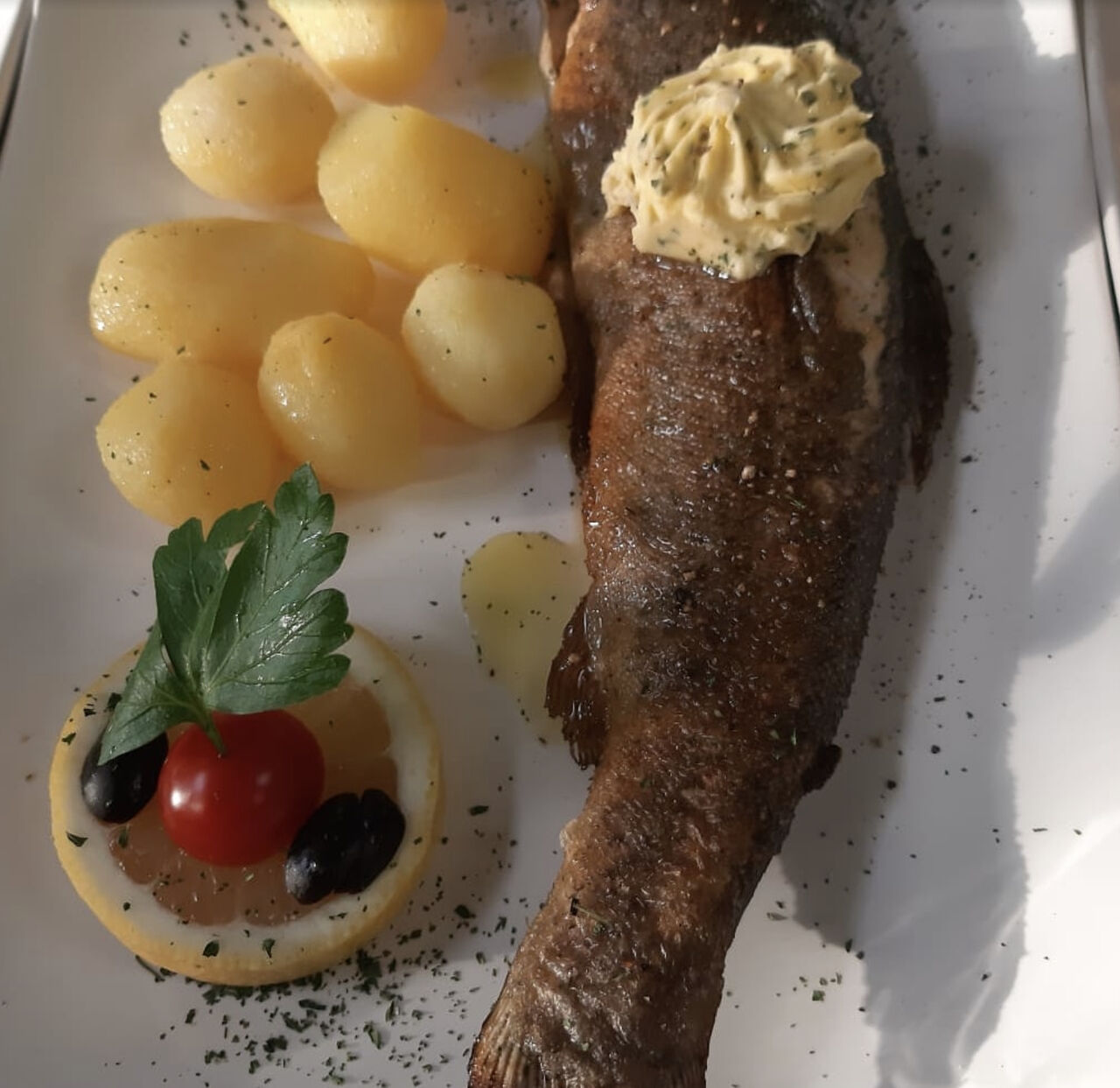 Unser Fisch lässt sich sehen, fangfrische Forelle hat da nochmal ein ganz anderes Aroma!